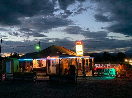Imagine my surprise when my eyes landed on a sign reading Twin Peaks a scant 10 seconds after uttering the phrase, particularly in the sleepy semi-rural hamlet of Hood River, Oregon. One of my best friends and i were wending our way randomly through the ganzfeld effect of a light, fluffy snowstorm in the Columbia River Gorge in search of a hike that wasn’t wet and freezing. We settled for spicy burgers and seasoned curly fries at Big Jim’s Drive In while we searched.